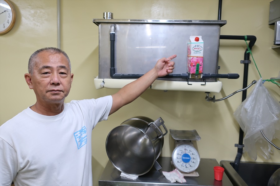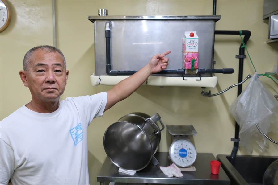 どうしても石灰などが多くなってしまう沖縄の水をそのまま使わず、活水器で浄水、その後特性の浄水装置にてパイロゲンの希釈液を混ぜ、一晩置くところから仕込みがスタートします。しっかり水を作ることで、まろやかにいつまでもフカフカなパンに仕上がります。